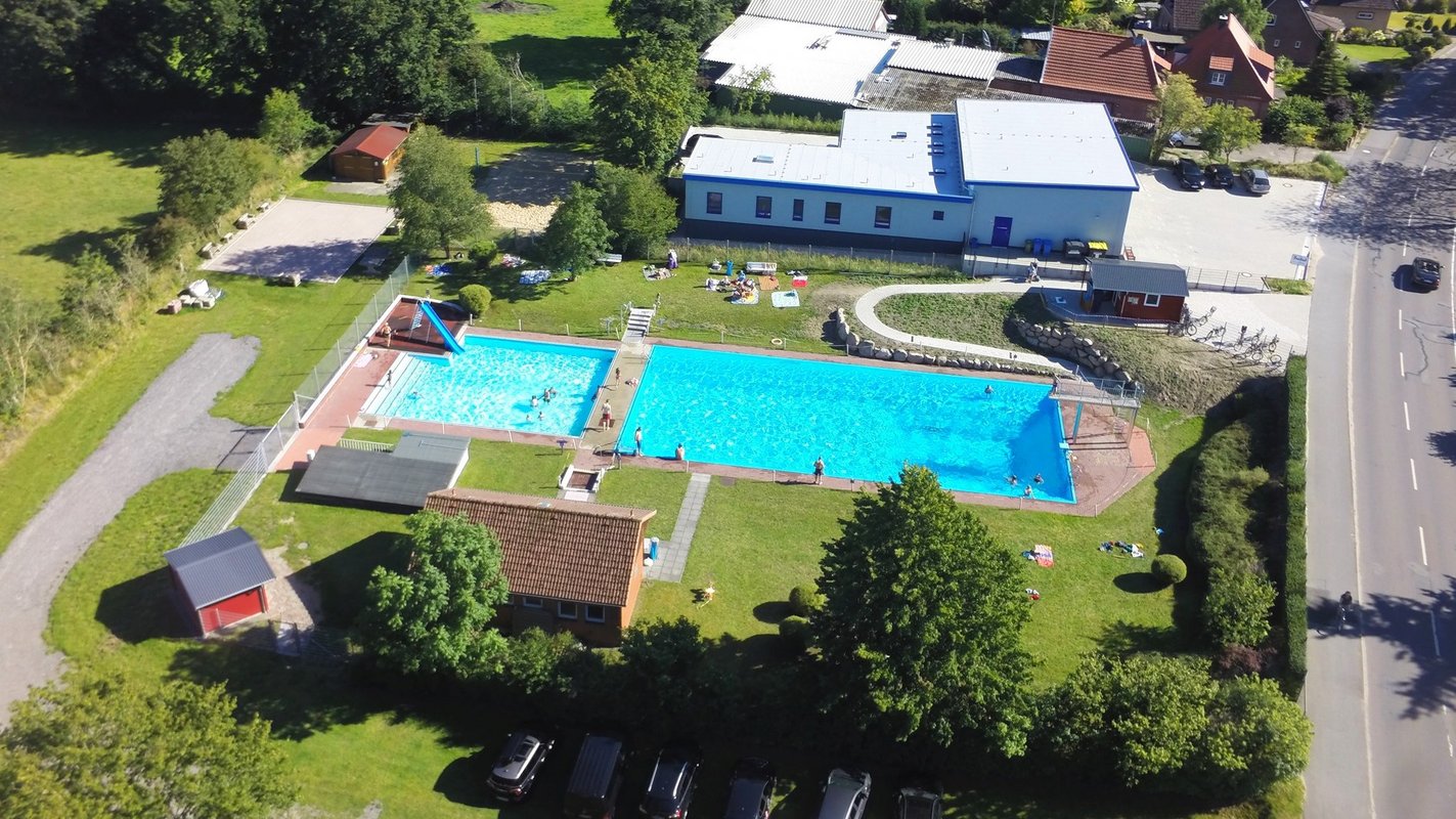 Auf der Hauskoppel des damaligen Gemeindevertreters Hermann Glüsing wurden auf einer Fläche von ca. 2000 Quadratmeter zwei Becken errichtet. Das Schwimmerbecken in einer Größe von 25 Meter x 12 Meter erhielt für die Nutzung eines 3 -Meter-Sprungturms die notwendigen Ausmaße und Tiefe, sowie ein zusätzliches 1 Meter Sprungbrett.